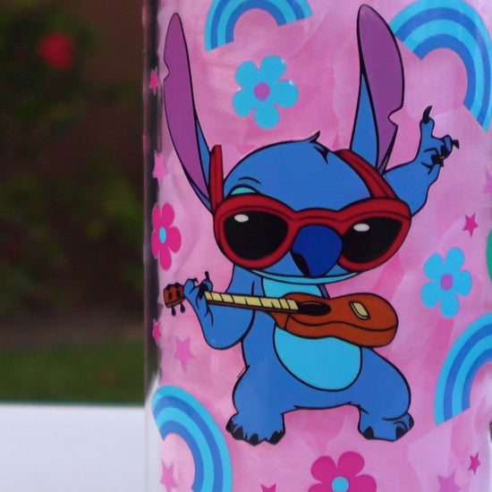 16oz Coloring Stitch Glass Tumbler with clear acrylic and bamboo lids and glass straw. UV DTF images. Comes with care instruction card.